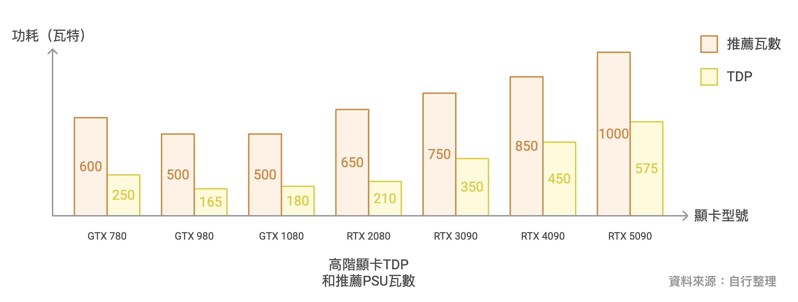 2010 年至 2020 年,高階顯卡功耗增長緩慢,從 GTX 780 到 RTX 2080 官方建議瓦數皆在500W~700W 之間,功耗提升幅度有限,對 PSU 需求影響不大,消費者在提升顯卡時,不一定要換電源供應器。