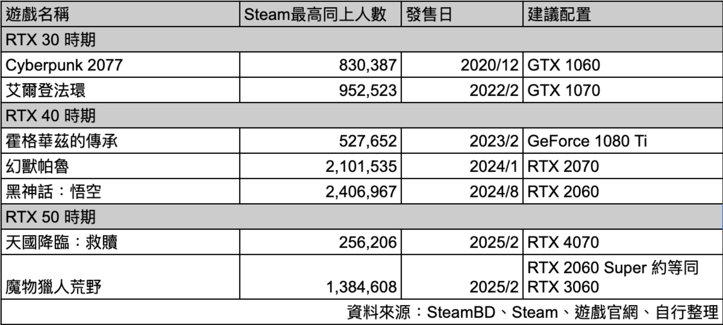 2025 年遊戲市場有多款大作發布,已發售的《天國降臨:救贖2》、《魔物獵人 荒野》除了玩家眾多外,對於顯示卡配備的需求也有顯著上升,《魔物獵人 荒野》建議配置約等同於 RTX 3060 的顯卡。實際觀察遊戲社群回饋,因遊戲效能優化不佳,一般會建議需要使用更高等級的配置,以滿足在一定會畫質要求下順暢遊玩。參考官方建議遊玩品質“高”需要配置 RTX 4060 Ti,“極高” 需要配置 RTX 4070 Ti Super(VRAM 16GB)。另一大熱門《天國降臨:救贖2》更是在建議配置就要求 RTX 4070 以上的高效能要求。