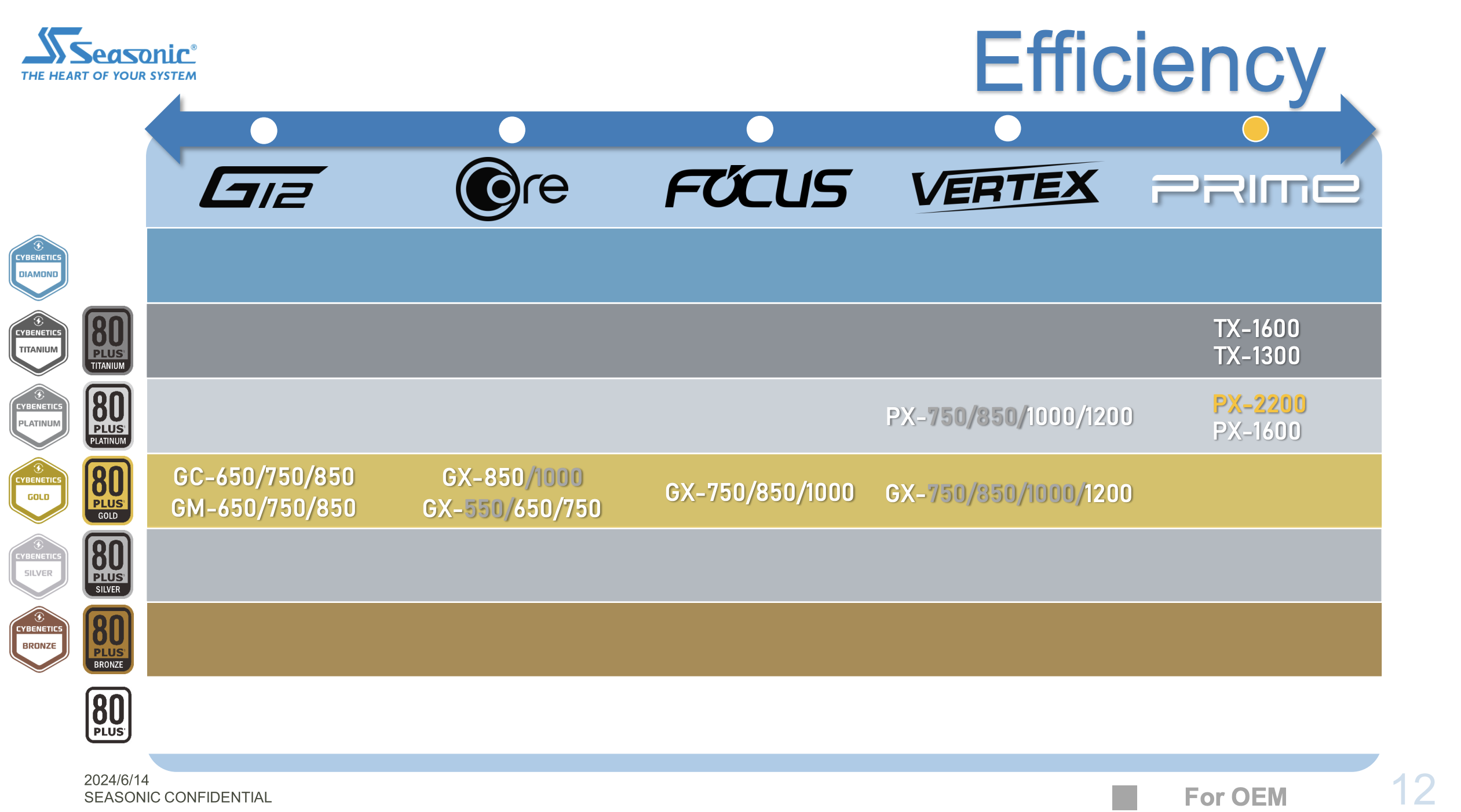 海韻 PSU 主要分為五種等級,G12 及 Core 較低階,主要用於套裝機市場。FOCUS 是 CP 值最高的主力產品線,多用於如 RTX 4050、4060 等最多玩家使用的中階顯卡市場。Vertex 及 Prime 則是給頂級顯卡及玩家使用,擁有最長的 12 年保固,講求最高級的靜音、溫控、能源效率、裝置保護。