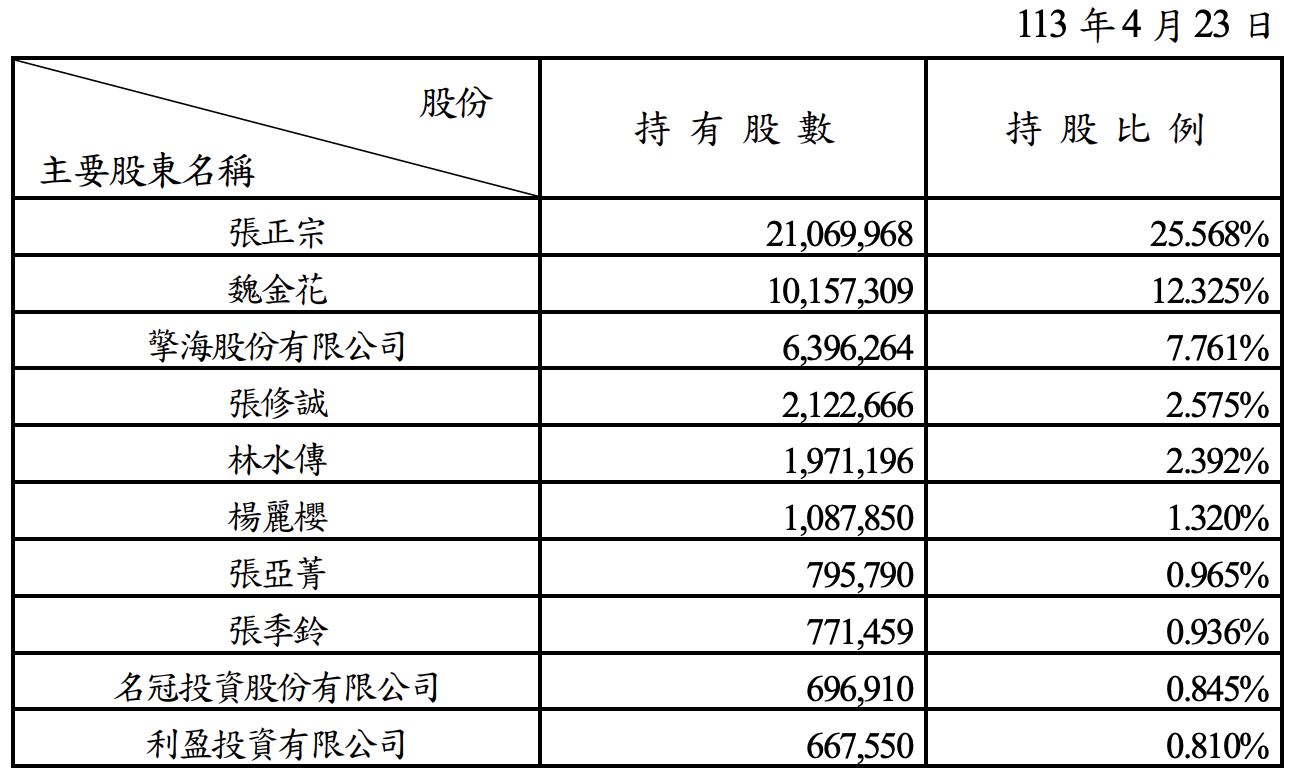 公司股權由家族持股 50.13% ,包含創辦人張正宗、其妻魏金花、子女張修誠等人及名下投資公司擎海。公司股權穩定,經營層利益與投資人一致。