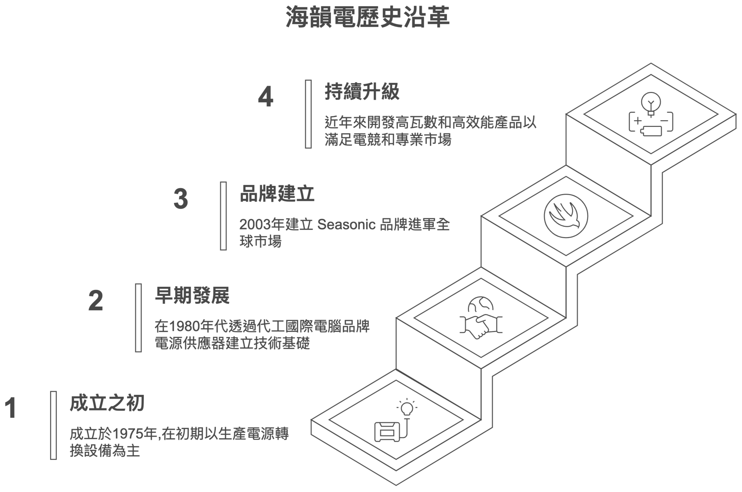 海韻電是一家專注於高階電源供應器(PSU)的製造商,以電競領域作為主要目標市場,並以自有品牌「Seasonic」進行銷售。該品牌在自組市場的電競玩家間備受推崇。相較於其他電源供應器製造商涉入領域多元,海韻電高度集中於 PC 市場,因此業務表現與電競市場的景氣具有高度連動性。