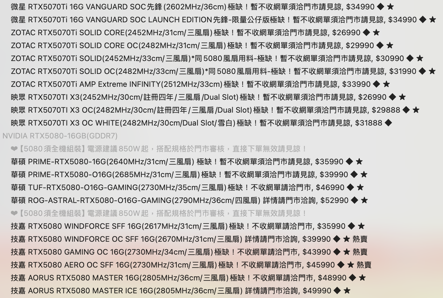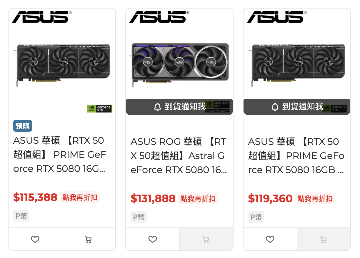 以 RTX 5080 為例,官方定價以匯率 35 換算約台幣 $35,000 元,但在知名購物網站 PChome上,只能看到要價 10 萬元以上的組合包,還都已銷售一空,一般玩家根本無法購得,更別提用當初所說的官方建議價格購買。