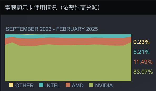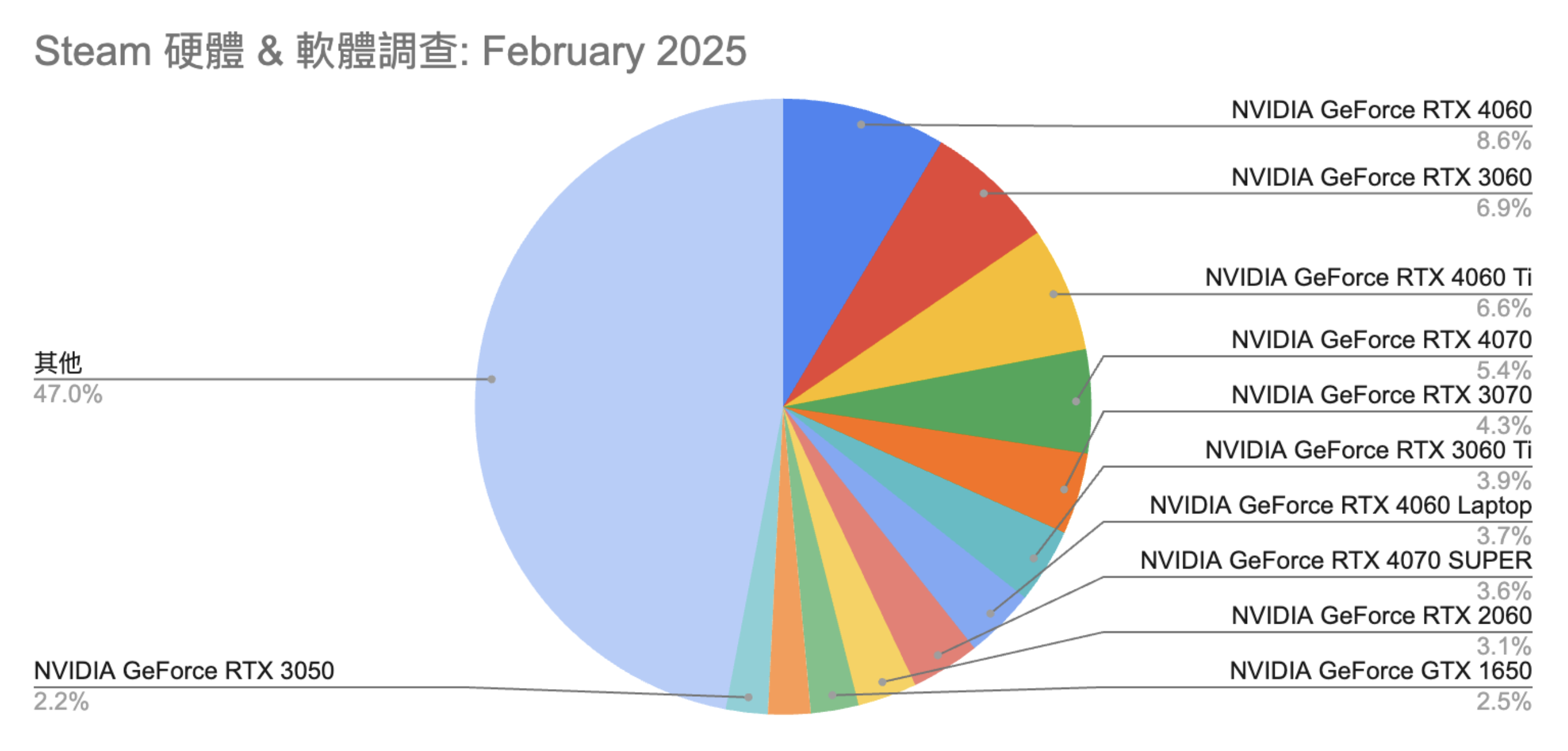 然而根據 Steam 最新於 2025/2月之統計,仍可看到 RTX 40 系列最終還是成為了玩家主流採用的選擇。由此可知,在電競 PC 產業中,單是新顯卡發售,無論其評價,都會是一個強力的正面驅動因子。