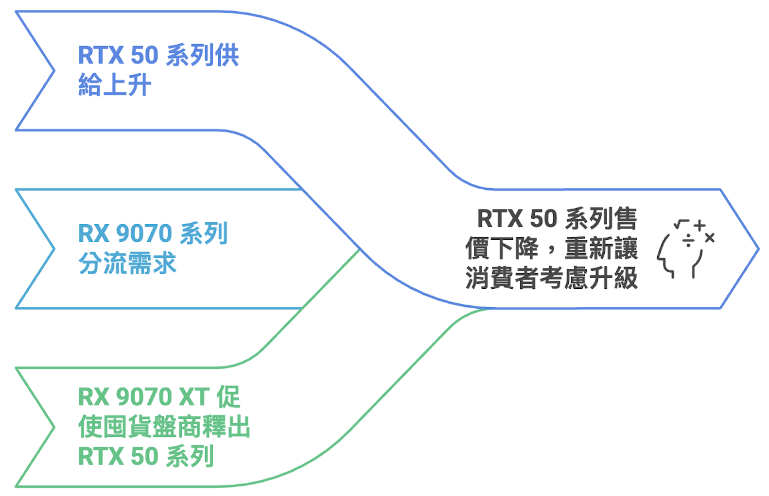 AMD RX 9070 XT 系列也有望分流玩家需求,讓部分原定購買 NVIDIA 顯卡的玩家轉向,從而使部分囤貨廠商在面臨壓力下,釋出手中的 NVIDIA 顯卡存貨,進而使 NVIDIA 顯卡售價回歸正常水準,以利等待中的消費者出手換機。