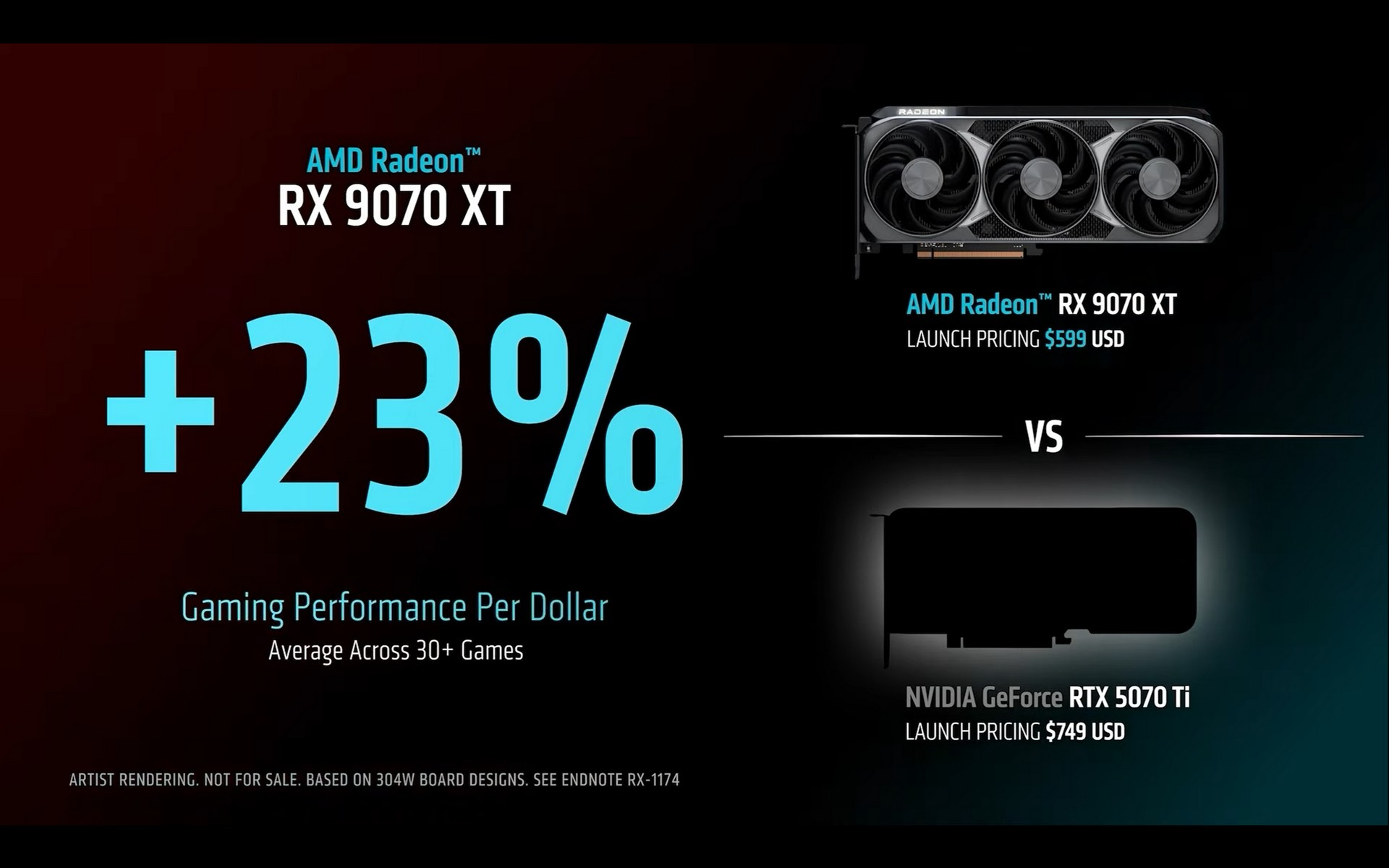 AMD 新一代顯卡 RX 9070 XT 對標 NVIDIA RTX 5070 Ti ,建議售價$599美金,相較 5070 Ti 便宜將近 20% ,在其官方宣傳效能上,更與 RTX 5070 Ti 相當。