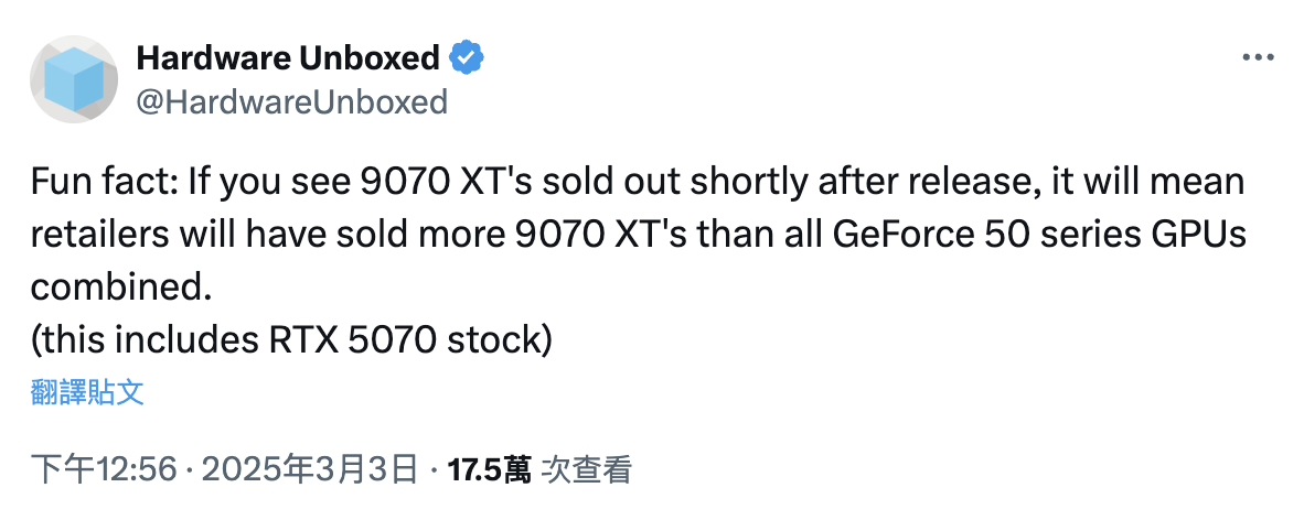 根據澳洲知名電腦硬體評測頻道 Hardware Unboxed 表示,9070XT 備貨甚至比整個 RTX 50系列加起來還多。