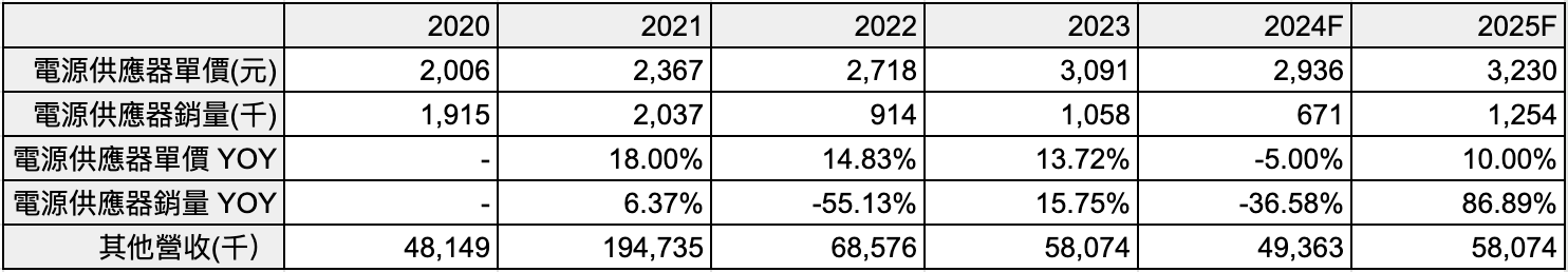 營收: 2024 年 電源供應器單價,預期在產業需求疲弱的狀況下特價求售,致使單價年增率下降 5%。2025 年受惠於新一代顯卡功耗提升及 ATX 3.0 規範擴大採用,預計會帶動高階、高功率產品銷售,估計單價將較前一年提升 10%。