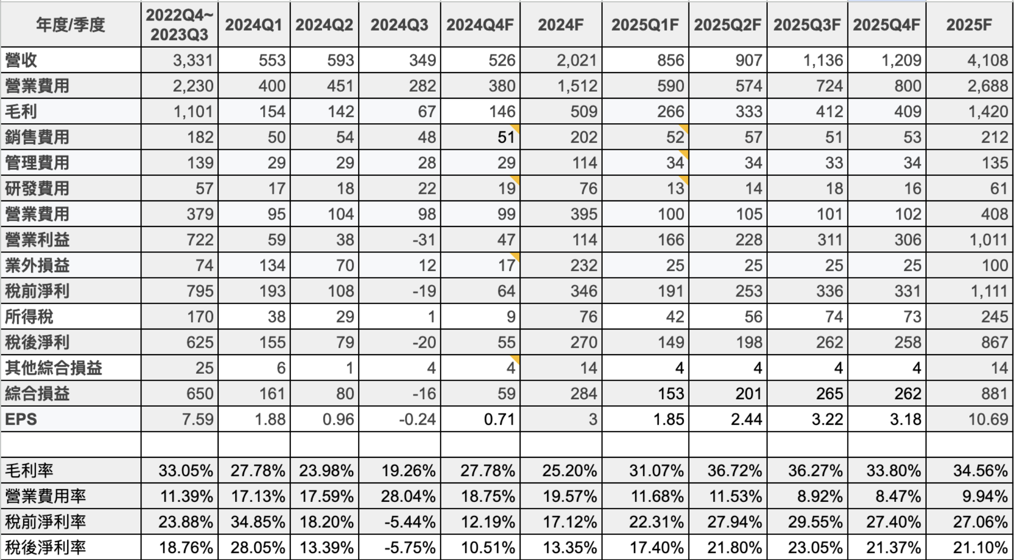 毛利率: 預期高階、高功率產品佔比提升,2025 年各季毛利率預估較 RTX40 系列發售後之 4 季(2022Q4-2023Q3)各提升 1.5%。