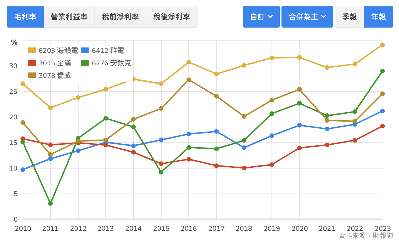 比較海韻電毛利率,與其他以 PC 市場為主要營收來源的同業,更可以觀察到海韻電因專注於高端產品線,及受到玩家青睞而得到的品牌溢價,為其帶來長期優於同業的高毛利率。