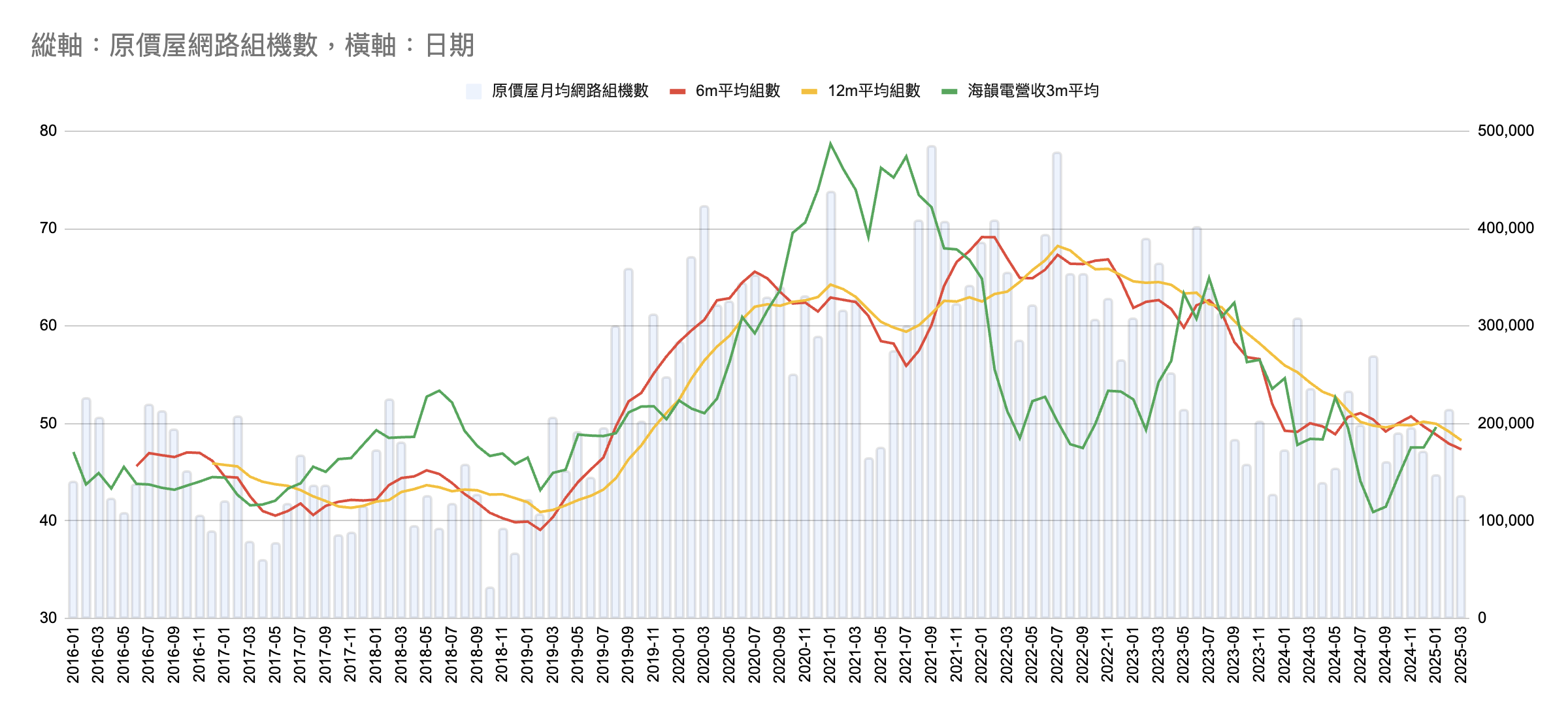 主要風險應為升級換機潮並未實際發生。 此處參考台灣最大電腦零組件廠商 「原價屋」所公布的網路組機數量,來推論全球 PC 換機潮的狀況。觀察歷史,原價屋之組機數量,與海韻電之三個月平均月營收具有一定相關性。