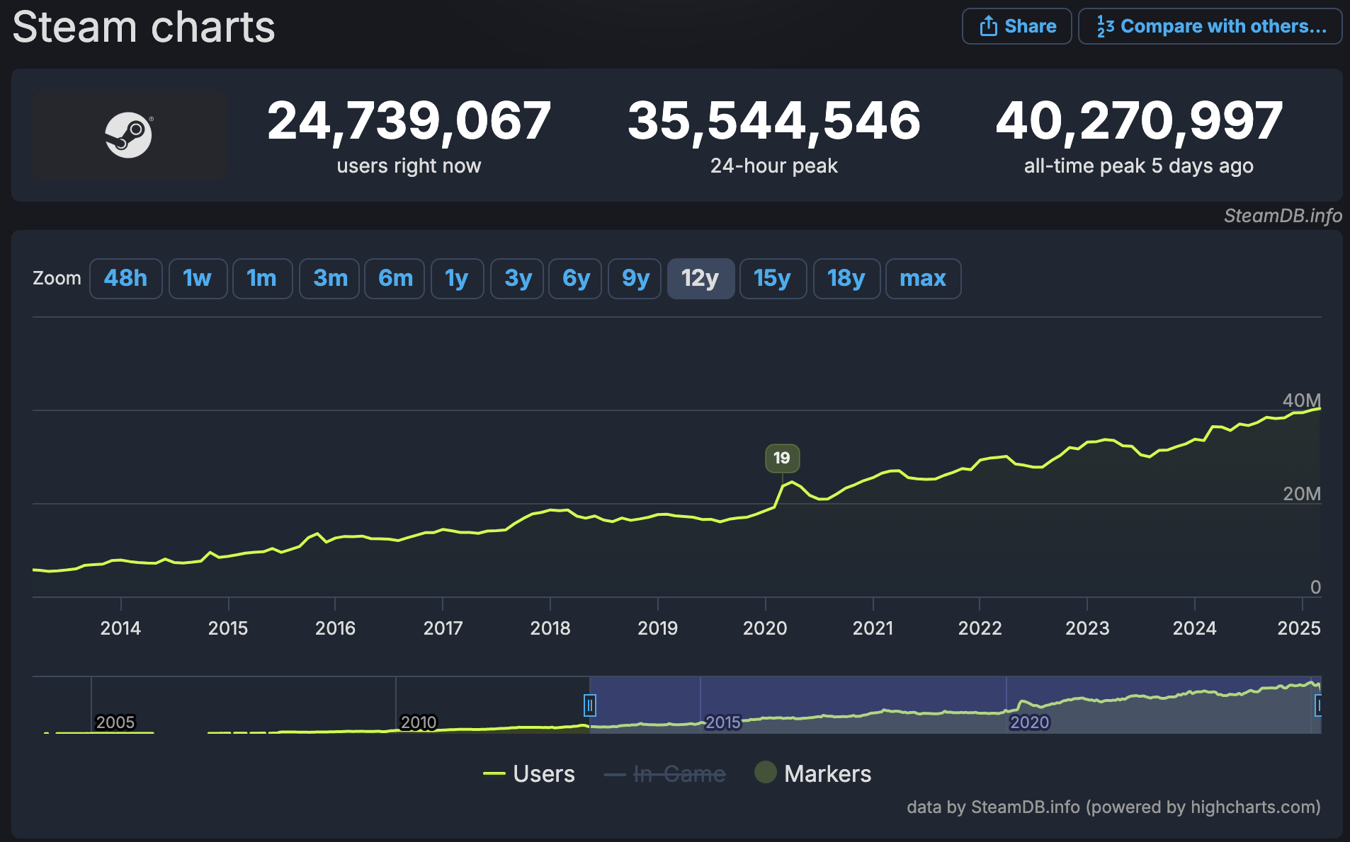 全球 PC 玩家人數持續增長, Steam 突破 4,000萬同上,產業趨勢向上